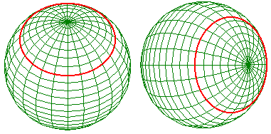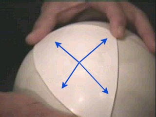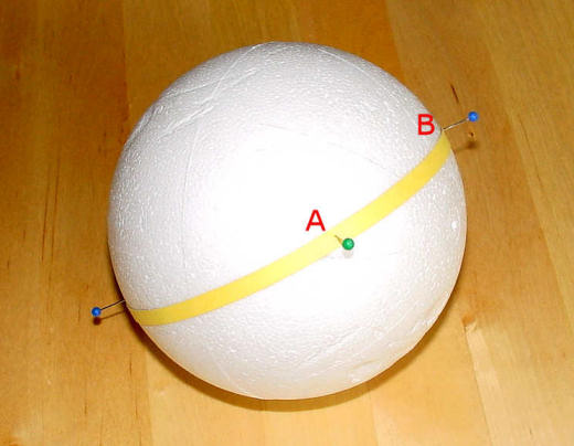 Non è difficile convincersi che la strisciolina aderisce alla palla lungo archi geodetici. Nella fotografia precedente vedete ad esempio l'arco geodetico AB; come sappiamo si tratta di un arco di circonferenza massima e, trattandosi in questo caso di un arco minore, rappresenta il percorso più breve, sulla superficie sferica, tra i punti A e B. E' importante capire che non è possibile far aderire la nostra strisciolina lungo percorsi che non siano archi geodetici, ad esempio lungo circonferenze minori (vedi figura seguente). Provate a farlo, vi renderete conto che è impossibile.