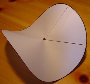Potete ottenerla facilmente procedendo in questo modo. Disegnate su un foglio di carta un cerchio e un settore circolare con lo stesso raggio del cerchio e un'ampiezza, diciamo, di 60 gradi (vedi figura seguente). Ritagliate il cerchio e il settore. Tagliate il cerchio lungo un suo raggio in modo che presenti una fessura. Inserite nella fessura il settore e fissatelo ai bordi della fessura con del nastro adesivo trasparente. Naturalmente questa operazione di inserimento non è possibile se si rimane nel piano (stiamo pretendendo di inserire altri 60 gradi in un angolo giro); ma potremo farlo se lascieremo flettere la superficie nella terza dimensione. Otterrete così una superficie a sella (è opportuno applicare del nastro anche sull'altra faccia della superficie). La realizzazione di questo modello è molto istruttiva: vi siete resi conto che una sella invade "più superficie" di quanta possa stare nel piano.