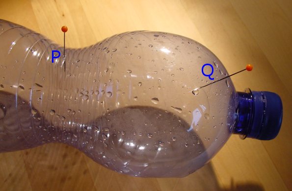 Considerate la superficie della bottiglia in figura (gli spilli rappresentano i vettori normali alla superficie in P e Q). La curvatura nel punto P è positiva o negativa? E nel punto Q?