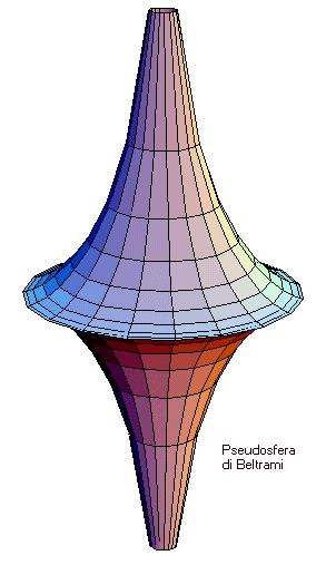 Nella figura seguente vedete una superficie pseudosferica, generata con Mathematica, di equazioni parametriche