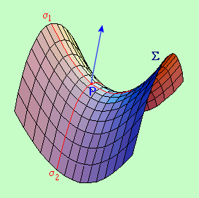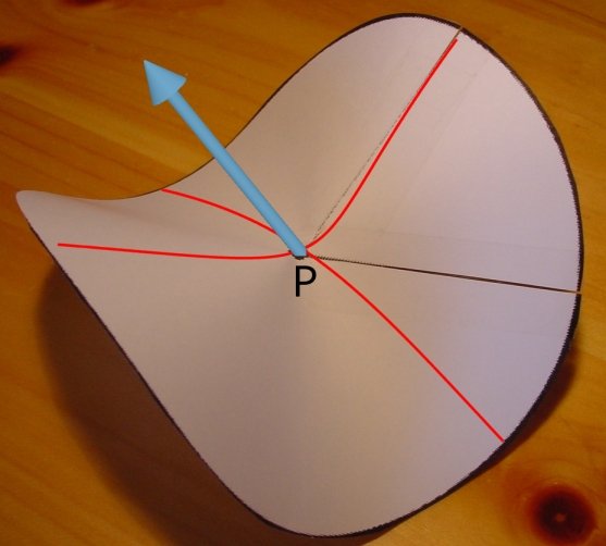 Le considerazioni precedenti concernono la curvatura di un'intera regione di una superficie o di un'intera superficie: ad esempio la superficie di un pallone ha curvatura positiva in ogni suo punto (inoltre la curvatura è costante, uguale in tutti i punti). Ma esistono superfici che hanno regioni a curvatura positiva e regioni a curvatura negativa come ad esempio la superficie di un toro. Per renderci conto se la curvatura di una superficie è in un punto P positiva o negativa dobbiamo considerare le sezioni normali per P (cioè le curve che si ottengono come sezioni della superficie con un piano passante per la perpendicolare alla superficie in P): se la curvatura in P è positiva tutte le sezioni normali per P volgono la concavità dalla stessa parte rispetto alla normale (comunque orientata), se la curvatura è negativa volgono la concavità sia da una parte che dall'altra. Nella fotografia seguente vedete due sezioni normali per un punto P di una sella: le due curve hanno concavità opposta e ciò ci conferma che la curvatura in P è negativa.