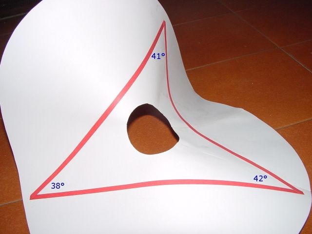 Nella fotografia seguente vedete un triangolo tracciato su una sella (curvatura negativa). I lati del triangolo sono naturalmente archi geodetici, ottenuti incollando sulla superficie le solite striscioline (e rappresentano i percorsi più brevi per collegare i tre vertici). Sul piano concettuale è importante capire che siamo di fronte proprio a un triangolo: i suoi lati, infatti, sono intrinsecamente rettilinei. Un essere bidimensionale il cui spazio (bidimensionale) fosse questa superficie considererebbe "dritti" i tre lati del triangolo (la curvatura è apprezzabile solo nella terza dimensione). Ora attenzione: se misuriamo i tre angoli del triangolo ci accorgiamo che la loro somma è minore di 180°; nel nostro caso la loro somma è di circa 121° (potete misurare gli angoli con un normale goniometro).