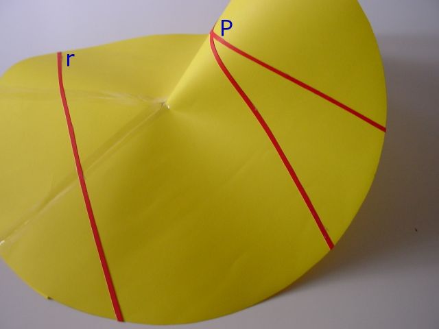 La questione delle somme angolari è di enorme rilevanza: ricordate infatti che la proprietà dei triangoli (euclidei) di avere la somma degli angoli uguale a un angolo piatto è logicamente equivalente al quinto postulato. Osservando le fotografie seguenti che mostrano una superficie a sella da due diversi punti di vista, potete rendervi conto che per un punto P esterno ad una retta r (cioè ad una geodetica r) passano infinite parallele ad r (cioè infinite rette che non intersecano r); in particolare ne vedete due: le rette s e t (ma anche tutte quelle "comprese" tra s e t non intersecano r).