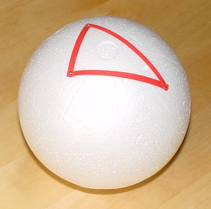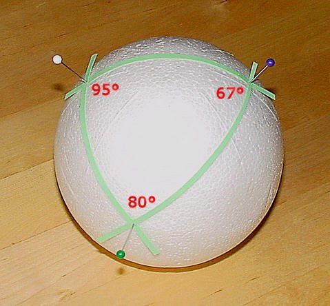 Un esperimento analogo possiamo farlo costruendo dei triangoli sulla superficie di un pallone (curvatura positiva); anche in questo caso incolleremo delle striscioline di cartoncino (usando della colla a presa rapida, tipo Attack, o degli spilli). Potremo verificare che qui la somma degli angoli di un triangolo è sempre maggiore di 180°. Nella fotografia seguente vedete un triangolo sferico la cui somma angolare è di circa 242°.