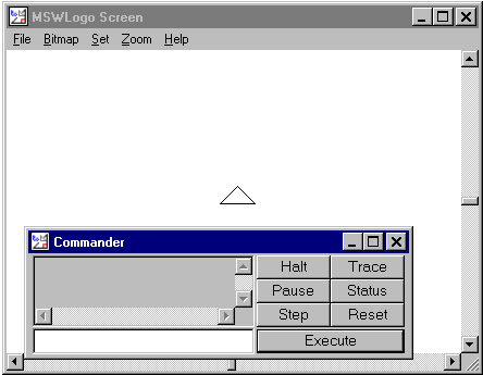 Sovrapposta alla finestra principale vedete una finestra più piccola denominata commander: è il centro di comando che ci consentirà di impartire istruzioni alla tartaruga. Nel centro di comando vedete, in basso, un campo di input e sulla destra una serie di pulsanti di cui avremo modo di parlare.