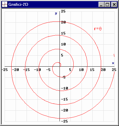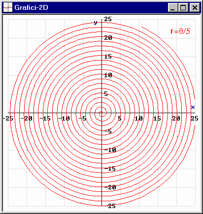 Nelle figure seguenti vedete i grafici generati con Derive, in un sistema di coordinate polari, di due spirali di Archimede. Nella prima è k=1, nella seconda è k=1/5.