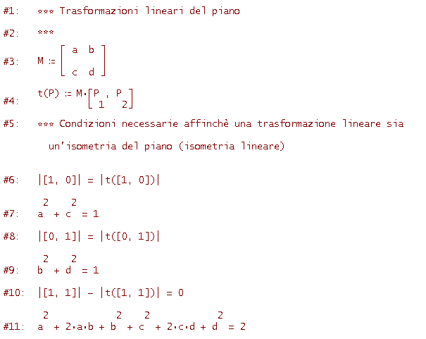 Una matrice quadrata M che verifichi le due condizioni precedenti si dice ortogonale. Proveremo tra poco che una matrice ortogonale ha sempre determinante non nullo (quindi la corrispondenza individuata da una matrice ortogonale è biunivoca, è cioè una trasformazione geometrica). Mostriamo che l'essere M una matrice ortogonale è condizione sufficiente (oltre che necessaria, come si è visto) affinchè la trasformazione lineare definita da M sia un'isometria. Basta dimostrare che si conserva il modulo di qualsiasi vettore; procedendo con Derive