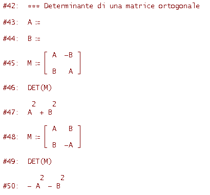 Quindi, tenendo conto che A2 + B2 = 1, il determinate di una matrice ortogonale, cioè della matrice di un isometria lineare, è 1 oppure -1. Ciò è in accordo col fatto che un'isometria, conservando le distanze, conserva le aree (vedi l'esperimento 2 dell'attività 1). Osserva inoltre che se la matrice M è del tipo della riga #45 si tratta di un'isometria diretta, se è del tipo della riga #48 di un'isometria indiretta. Ricorda infatti che se il determinante di una trasformazione lineare è positivo allora si conserva l'orientamento (vedi l'esperimento 2 dell'attività 1) se è negativo si inverte l'orientamento.