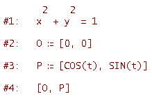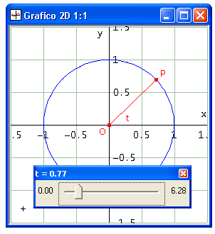 Inserisci, nella finestra grafica, una slider bar per il parametro t facendo variare t da 0 a 2PI (PI indica pigreco); poi traccia la rappresentazione grafica relativa alla righe #1 e #4. Otterrai la figura seguente ed agendo sul cursore della slider bar potrai ruotare il vettore OP (in senso antiorario al crescere di t).