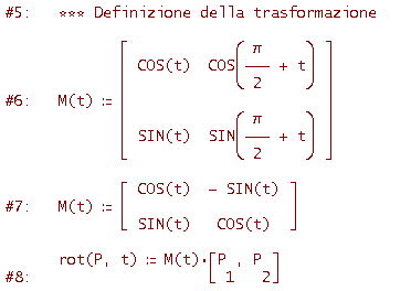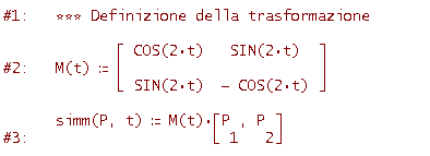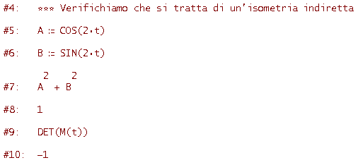 Osserva che semplificando la riga #6, Derive mette la matrice M(t) nella forma più semplice della riga #7 (applicando le note formule trigonometriche per archi che differiscono di 90°). La riga #7 ci fa capire che la matrice M(t) è del tipo
