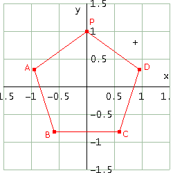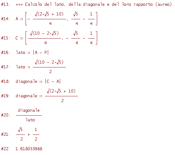 Visto che ci siamo, è anche facile calcolare la lunghezza del lato del pentagono (è il modulo del vettore PA) e la lunghezza della diagonale (è il modulo del vettore AC); potremo così verificare che il rapporto tra le due misure è la sezione aurea. Ecco il codice
