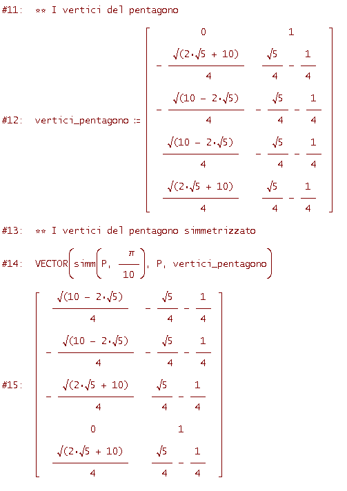 Proviamo il nostro comando simm(P, t). A titolo d'esempio consideriamo il pentagono regolare dell'esempio precedente (vai a rivedere la figura) e verifichiamo che torna su se stesso mediante una simmetria rispetto alla retta per l'origine e per il punto D (naturalmente si avrà una permutazione dei vertici). Tale retta forma evidentemente un angolo di