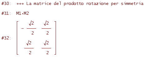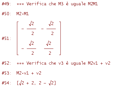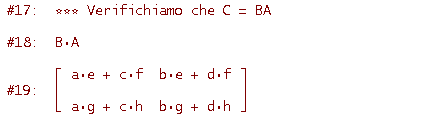 Mostriamo che il prodotto di due trasformazioni lineari t2 e t1 è ancora una trasformazione lineare e, se B ed A sono rispettivamente le matrici di t2 e t1 allora la matrice BA, prodotto delle due matrici, è la matrice della trasformazione prodotto t2t1 (questo fatto, per inciso, è un buon motivo per giustificare l'usuale definizione di prodotto tra matrici). Ecco il codice