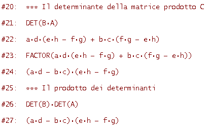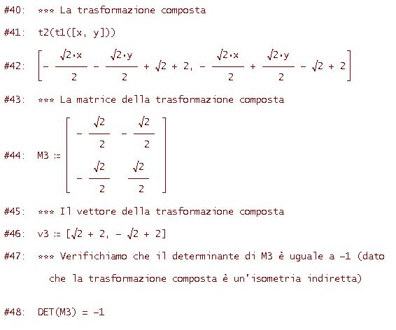 Verifichiamo che, essendo per ipotesi A e B due matrici a determinante non nullo, la matrice C ha anch'essa determinante non nullo e quindi la funzione composta è effettivamente una trasformazione geometrica (condizione di biunivocità); ciò segue dal fatto che il determinante del prodotto di due matrici è uguale al prodotto dei determinanti. Ecco il codice