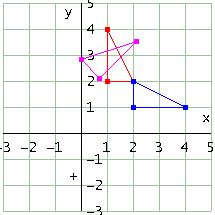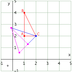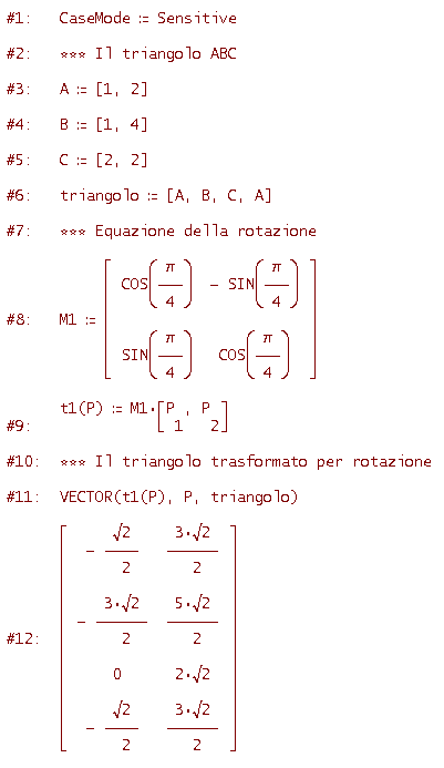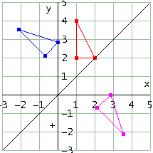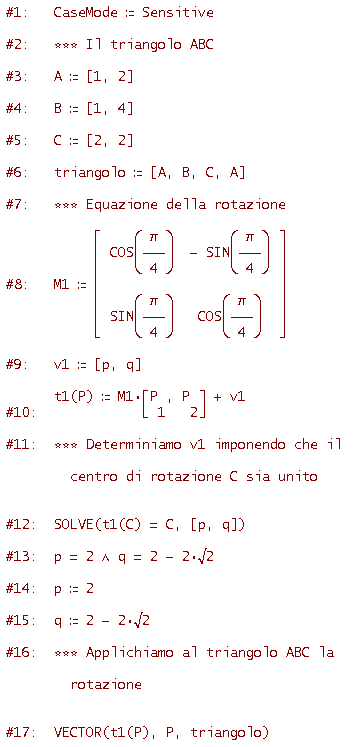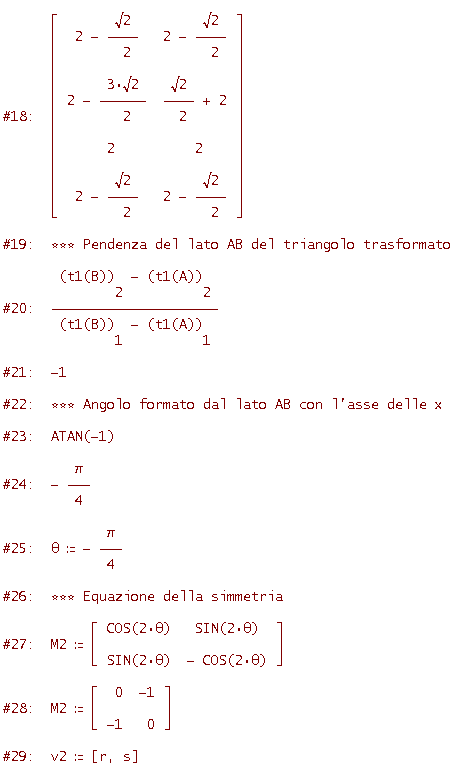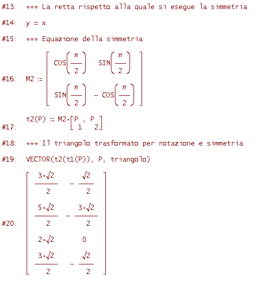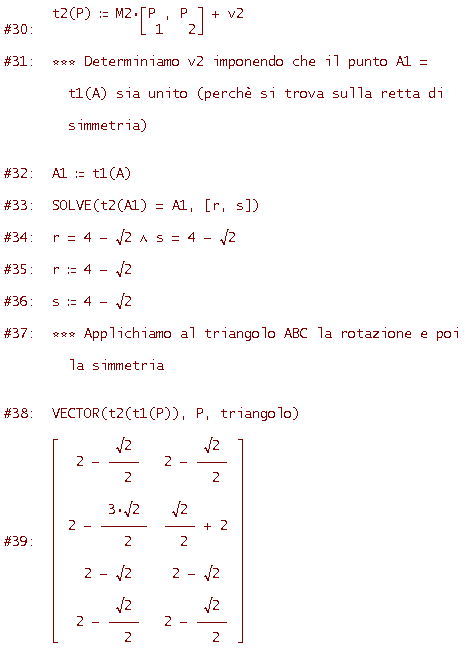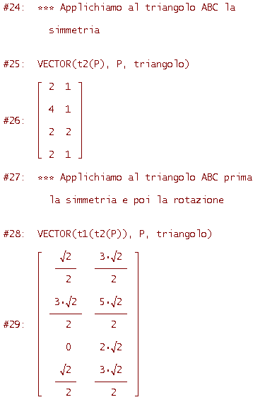 ![]() Ecco codice e figura (il triangolo rosso è quello di partenza, quello azzurro è il trasformato per rotazione, quello rosa è il trasformato per rotazione e simmetria)