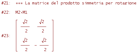 Considera il triangolo ABC con A=[1, 2], B=[1, 4], C=[2, 2]. Applica al triangolo la trasformazione ottenuta componendo nell'ordine una rotazione antioraria di 45° rispetto all'origine e una simmetria rispetto alla retta di equazione y=x. Applica quindi le trasformazioni in ordine inverso, cioè prima la simmetria e poi la rotazione: ottieni la stessa trasformazione composta? (Vale, cioè, la proprietà commutativa per il prodotto di trasformazioni?)