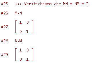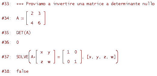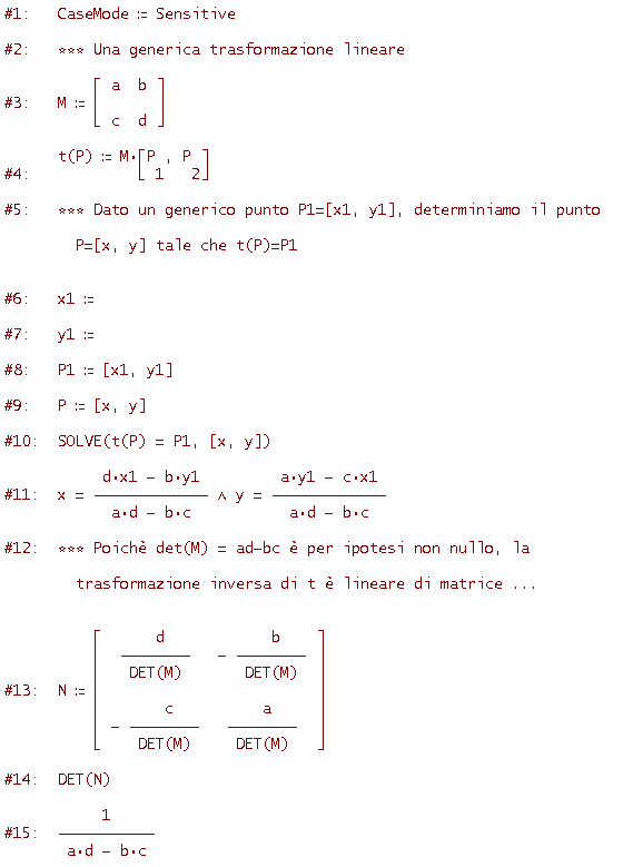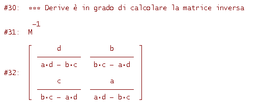 ![]() Ecco il codice Osserva che il determinante della matrice N è uguale all'inverso del determinante della matrice M (riga #15): poichè M è non nullo anche N sarà non nullo. La matrice N che abbiamo determinato prende il nome di matrice inversa di M ed è tale che Ciò consegue dal fatto che, come si è visto nell'attività precedente, la matrice del prodotto di due trasformazioni lineari è uguale al prodotto delle matrici delle due trasformazioni e nel nostro caso il prodotto delle trasformazioni è la trasformazione identica (che, come sappiamo, ha per matrice la matrice unità). Facciamo una verifica con Derive Tieni presente che non tutte le matrici quadrate sono invertibili (o, si dice anche, non singolari): lo sono solo quelle che rappresentano una trasformazione geometrica (corrispondenza biunivoca) cioè quelle che hanno determinante non nullo. La matrice inversa di una matrice M, se esiste, viene indicata col simbolo M-1Proviamo a far calcolare la matrice inversa di M a Derive Ora consideriamo una matrice a determinante nullo e verifichiano che non è invertibile