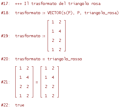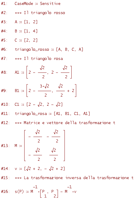 Considera l'isometria t, determinata nell'esperimento 2 dell'attività precedente, di matrice e vettore che porta il triangolo rosso nel triangolo rosa. Determina la trasformazione inversa e verifica che porta il triangolo rosa nel triangolo rosso. ![]() Ecco il codice