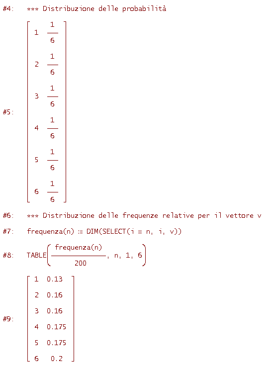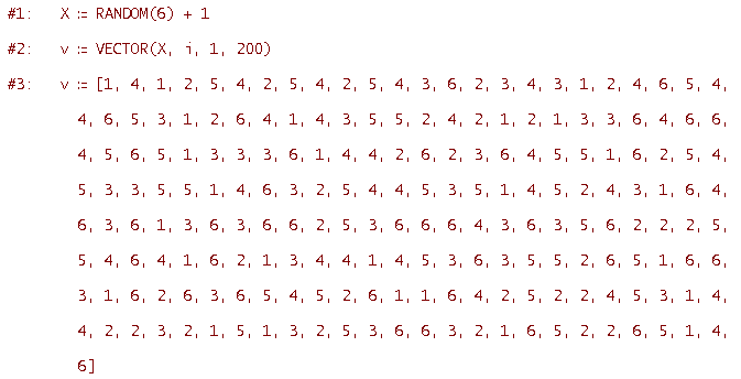 Il vettore v definito alla riga #2 è costituito da 200 valori della variabile casuale X (perché i varia da 1 a 200 e per ogni valore di i viene valutata la variabile X); la riga #3 la ottieni semplificando la #2. Fai attenzione però a non semplificare l'assegnazione della riga #1 altrimenti ad X sarebbe assegnato un valore una volta per tutte e otterresti perciò un vettore v costituito da 200 valori tutti uguali. Non semplificando la #2 hai un'assegnazione differita e ogni valutazione di X produce un nuovo valore casuale tra 1 e 6.