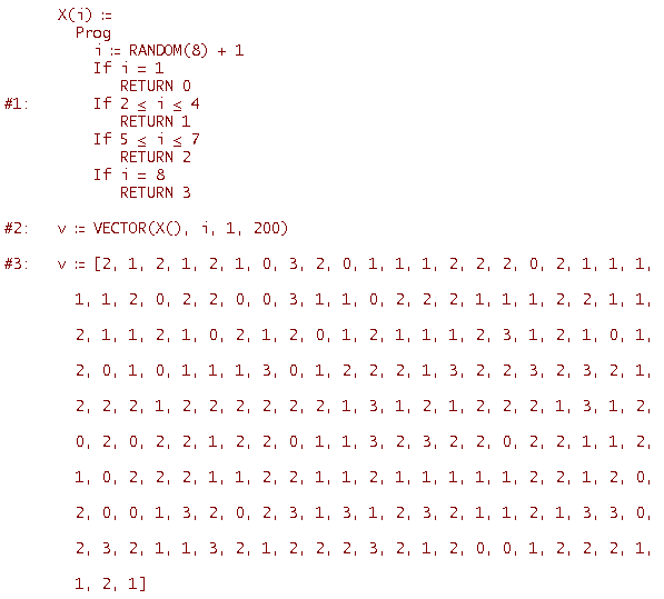 Ed ecco il codice di Derive per generare un vettore v di 200 valutazioni di X