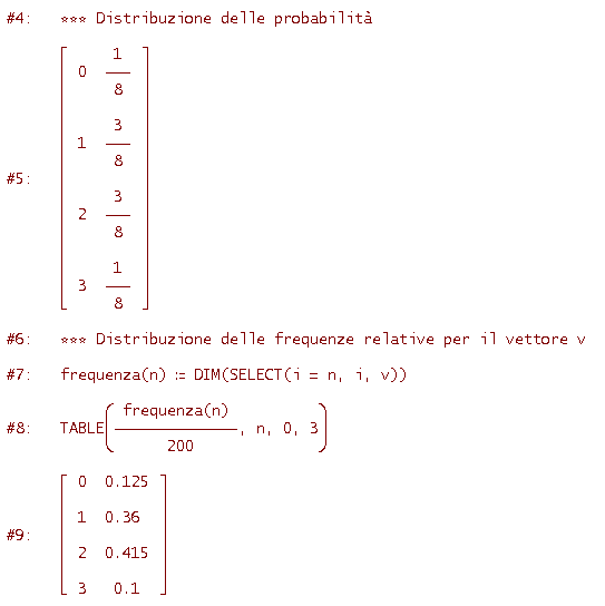 (ad esempio si ottiene il valore 1 nei tre casi TCC, CTC, CCT su 8 casi possibili). Per definire la variabile X con Derive dovremo scrivere un semplice programma (una funzione): genereremo un numero intero casuale i compreso tra 1 e 8 e metteremo in uscita
