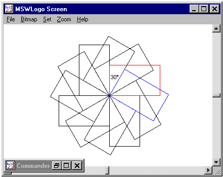 La procedura RuotaRettangolo usa al suo interno la procedura rettangolo, da noi precedentemente definita, come una qualsiasi altra istruzione. La procedura RuotaRettangolo ripete 12 volte le due istruzioni rettangolo e rt 30: viene tracciato un primo rettangolo (evidenziato in rosso), poi la tartaruga ruota di 30° e quindi traccia il secondo rettangolo (evidenziato in blu) partendo in una nuova direzione, di nuovo ruota di 30° e traccia il terzo rettangolo e cosė via fino a completare il giro (vengono eseguite 12 rotazioni di 30° per un totale di 360°).